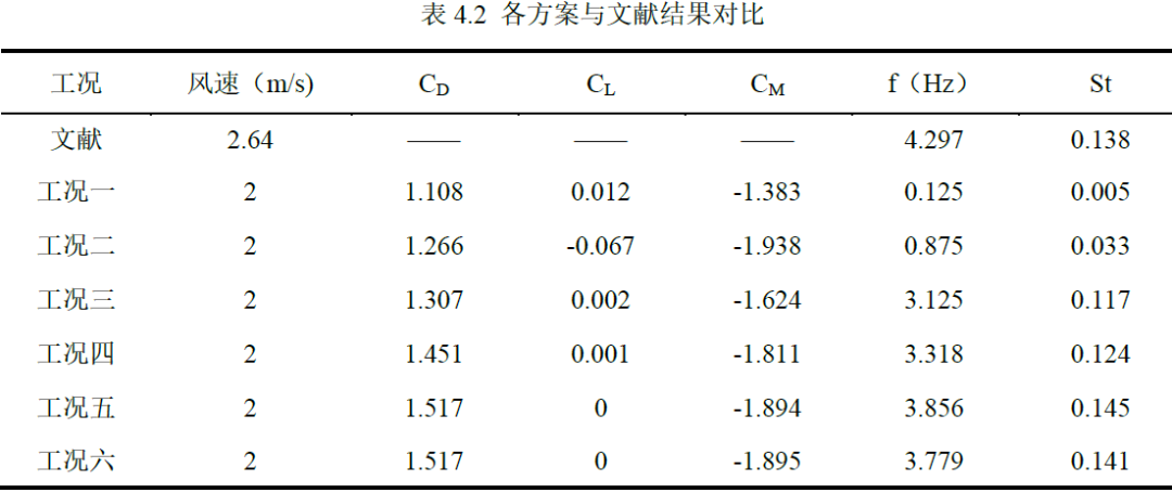 )的时程数据,并进行快速傅里叶变换(FFT),可以获得矩形断面在不同工况下的漩涡脱落频率。利用公式4.2 计算各个工况下的斯托罗哈尔数(St),并将结果与文献中的结果进行对比,以验证数值模拟的准确性。