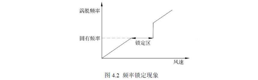 对于静止的刚性结构,随着风速的增加,旋涡脱落频率会相应地改变。然而,对于柔性结构,情况会有所不同。当旋涡脱落频率接近结构的自然振动频率时,结构会因此产生较大幅度的振动响应。在某些情况下,当结构的振动频率与旋涡脱落频率接近时,结构的振动会影响到旋涡脱落的频率,使得它与结构的振动频率保持同步。这种现象被称为频率锁定。在频率锁定的风速范围内,旋涡脱落的频率不再随风速的变化而改变,而是保持与结构振动频率相匹配。如图4.2 所示