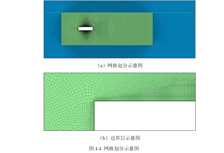 为提高数值模拟的计算精度与计算速度,风场计算域分为近壁面区域与外围区域。按照《公路桥梁抗风设计规范》的规定,断面的壁面处应设置层高从内向外递进的边界层,边界层10 层,总高度为0.005m,增长率为1.5。近壁面区域壁面边界尺寸为0.001m,外侧边界尺寸为0.002m,网格尺寸为0.002m,网格数为287311,设置为动网格;外围网格尺寸为0.01m,网格数为296196;风场计算区域共583507 个网格,所有网格均采用三角形+四边形的2D 德劳内网格,如图4.4 所示。