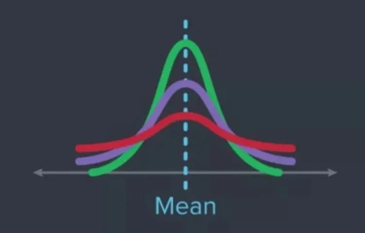方差决定了正态分布曲线的形态,它精确量化了数据点偏离均值的平均距离。方差越大,曲线越“矮胖”,数据越分散;方差越小,曲线越“瘦高”,数据越集中。固定平均值不变,改变方差的值,则曲线的位置不变,但随着方差的减小,曲线变得陡峭,如下图所示。这是为什么呢?