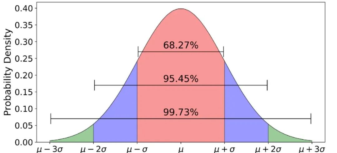 在一组符合正态分布的数据中,约 68% 的数据落在(μ-σ, μ+σ )区间内,约 95% 的数据落在(μ-2σ, μ+2σ )区间内,约 99.7% 的数据落在 (μ-3σ, μ+3σ )区间内。