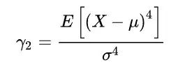 峰度是描述数据分布形态陡缓程度的统计量,峰度越大,数据分布越陡峭,尾部越厚;峰度越小,数据分布越平滑。峰度的计算公式为: