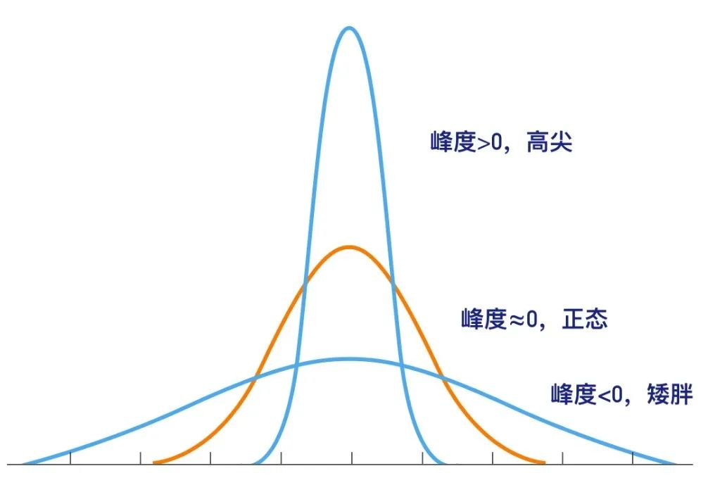 正态分布的峰度为3,很多情况下,为方便计算,一般将正态分布的峰度值减去3,这样使得其峰度变为0,更方便进行比较。当数据的峰度为0时,表示数据分布的陡缓程度与正态分布相同;峰度大于0,表示数据分布比正态分布更陡峭,而峰度小于0,表示数据分布比正态分布更平坦;峰度的绝对值越大,表示数据分布形态与正态分布的差异越大。
