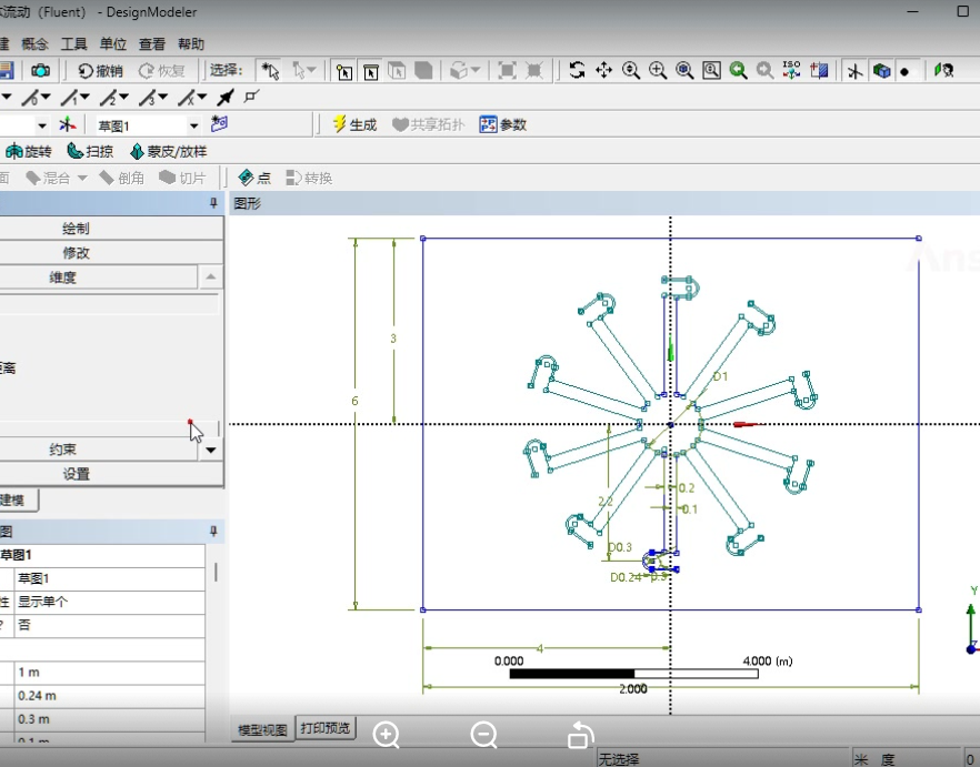 - 基础设置:单位与草图平面 打开软件后,先将全局单位设置为米(m)(后续尺寸标注更直观,避免单位换算错误); 新建草图,选择XY 平面作为绘图基准面(水车结构对称,XY 平面便于旋转复 制)。