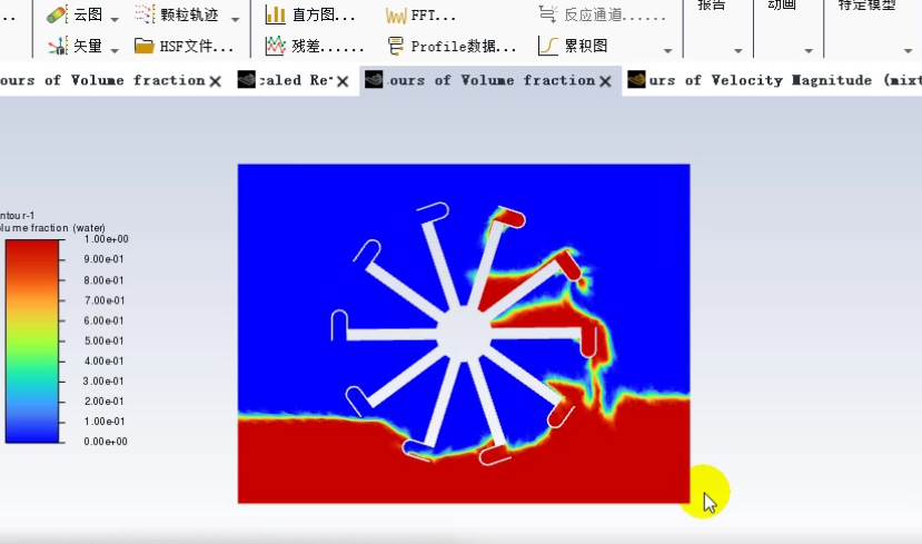 - 后处理:可视化结果 云图分析: 体积分数云图:查看水的分布(蓝色为水,红色为空气),验证水桶是否正常舀水; 速度云图:观察水流速度分布,重点看水桶附近及出口的流速变化;