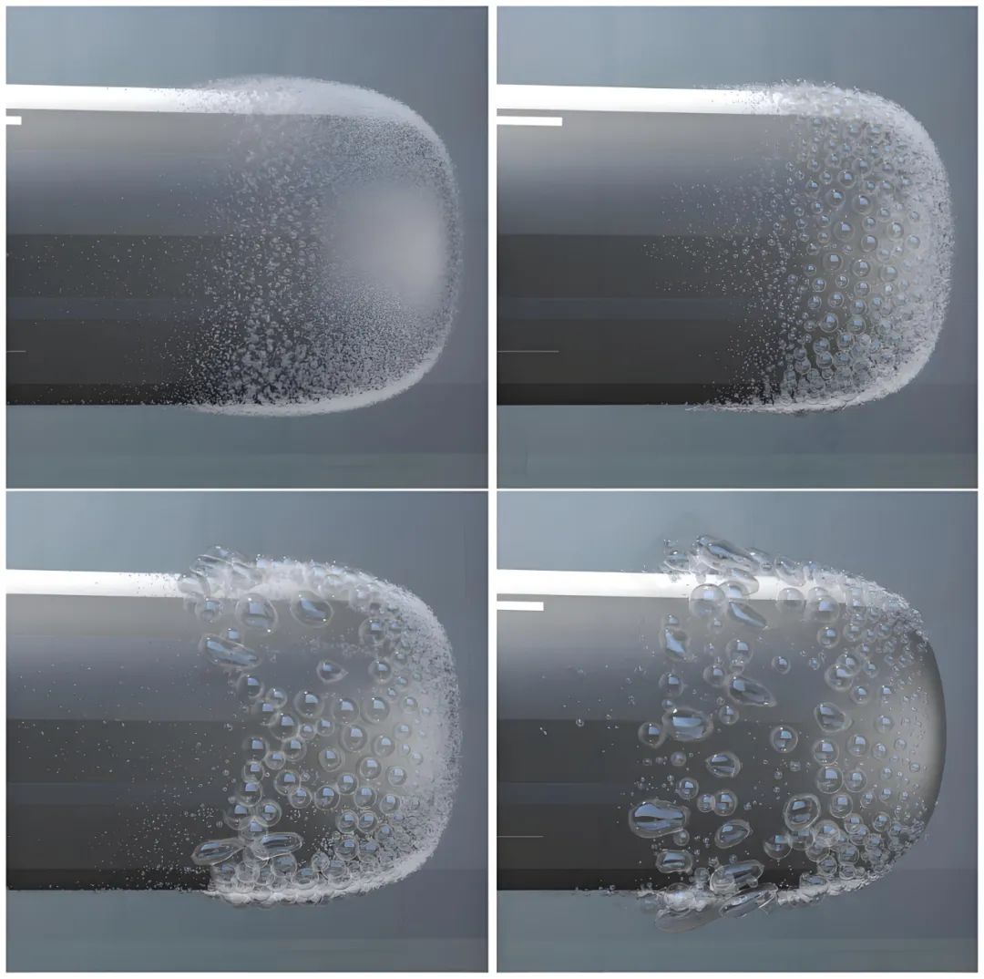空化气泡的数量及其大小由水中的核心密度决定,高核心密度意味着低压区域中有许多空化位点。因此每个核心在开始影响周围压力之前只能生长一小段距离——最终表现为一团小气泡。固体物体对核心密度的影响与其表面粗糙度成正比,表面越粗糙产生的核心就越多,论文通过改变亚网格气泡之间吸引力大小来模拟不同的核密度:吸引力越小,意味着核密度越高。