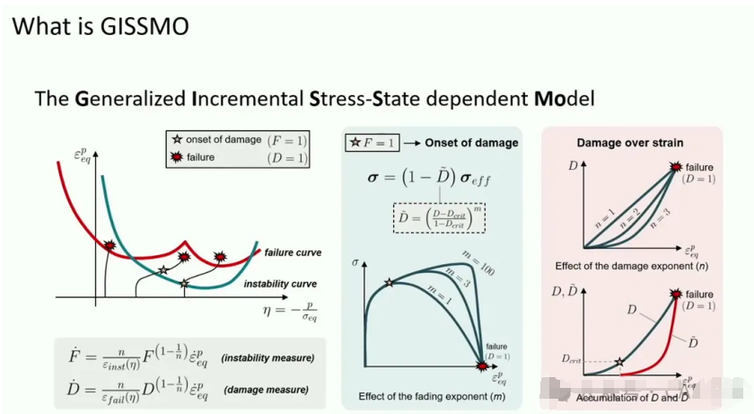 Gissmo失效模型涉及的相关理论非常多,涉及的相关参数也非常丰富,如应力三轴度、失效应变、不稳定性应变、损伤累积指数、应力退化指数、软化指数、中面失效、应变率、网格尺寸等。