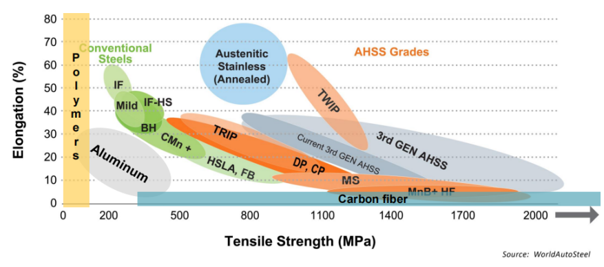 全球钢铁行业工程研究显示,新的先进高强度钢与现代工程设计和计算机辅助工程(CAE)工具的结合使用可以减少25%的车辆零部件。根据不同的碰撞载荷要求,新型的钢材发挥着重要作用。如通常使用双相或TRIP钢来确保在前部和后部压溃区结构中吸收高能量,而其他高强度钢则用于抵御侧面冲击和车顶的压溃,进而实现性能及重量的平衡。