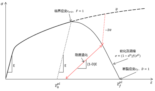 随着外力的继续加载,损伤不断增大,而宏观应力不断减小,当损伤为1时,材料失效,裂纹产生,损伤与应力耦合的关系图如下所示。从图中可以看出当材料达到临界应变后,即F=1,此时的应变即为GISSMO中的ECRIT,此时的损伤将会储存到DCRIT中;在此之后,损伤不断增大,宏观应力表现出明显的下降,刚度开始退化,当损伤达到1时,材料断裂,宏观应力为0,宏观应力与损伤的耦合表达式如下所示。