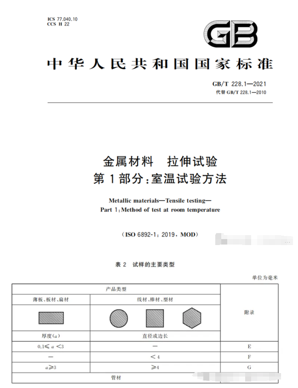 材料样件制作及测试方法可参考《GBT 228.1-2021 金属材料 拉伸试验 第1部分:室温试验方法》,在该标准中详细列出了多种断面样件的类型和计算方法。