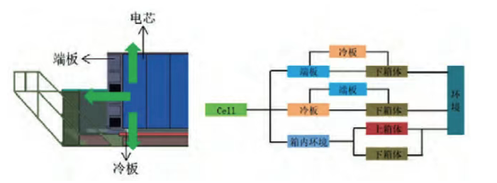 路径(1) 热量通过电芯大面传递给端板,其中一部分通过端板传递给电池箱体,另一部分通过端板传递给冷板,然后通过冷板传递给电池箱体,两部分热量均通过电池箱体散失到环境中;