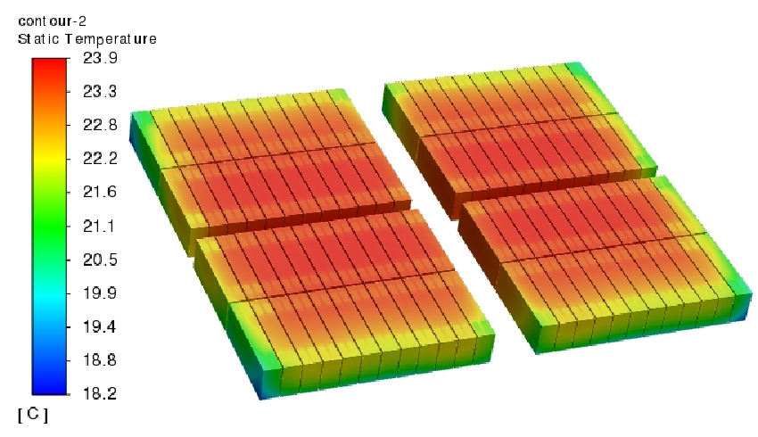 新能源电动汽车的低温“痛点”是指靠近端板位置的电芯由于受到端板传热的影响,温度较其他位置电芯要低,是重点保温部位。下图为低温保温工况下电池包温度分布云图。仿真结果显示,保温工况下电池包的低温“痛点”主要集中在靠近端板的位置,靠近端板位置的电芯温度最低,这也是造成电池包整体温差较大的主要原因。
