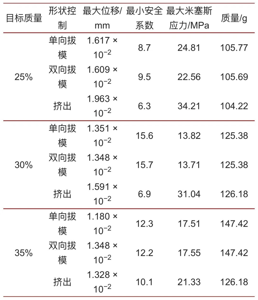当设置目标质量为原始质量的35%并采用挤出形状控制时,奇迹发生了——优化后的部件在最大位移、安全系数和米塞斯应力等关键指标均达到最优平衡。