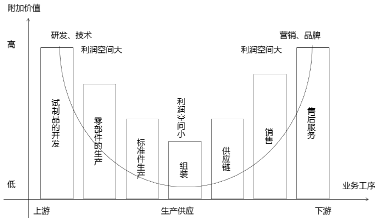 微笑曲线的特征是两端朝上,中间最低。左边是研发,右边是营销,中间是制造。在产业链中,附加值更多体现在两端——研发和营销,处于中间环节的制造附加值最低。因此产业未来应朝微笑曲线的两端发展,左边加强研发与创新,右边加强营销与服务。
