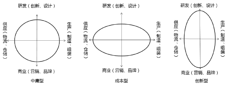 企业有四项基本功能:研发(创新、设计)、生产(制造、组装)、商业(营销、品牌)、供应(物流、仓储)。根据这些功能的强弱不同,会组合形成不同特征的企业。依据微笑曲线理论,这种组合会产生三种极限特征:1)研发、生产、商业和供应均衡的中庸型;2)生产和供应强、研发与商业弱的成本型;3)研发与商业强、生产与供应弱的创新型。如图2所示。