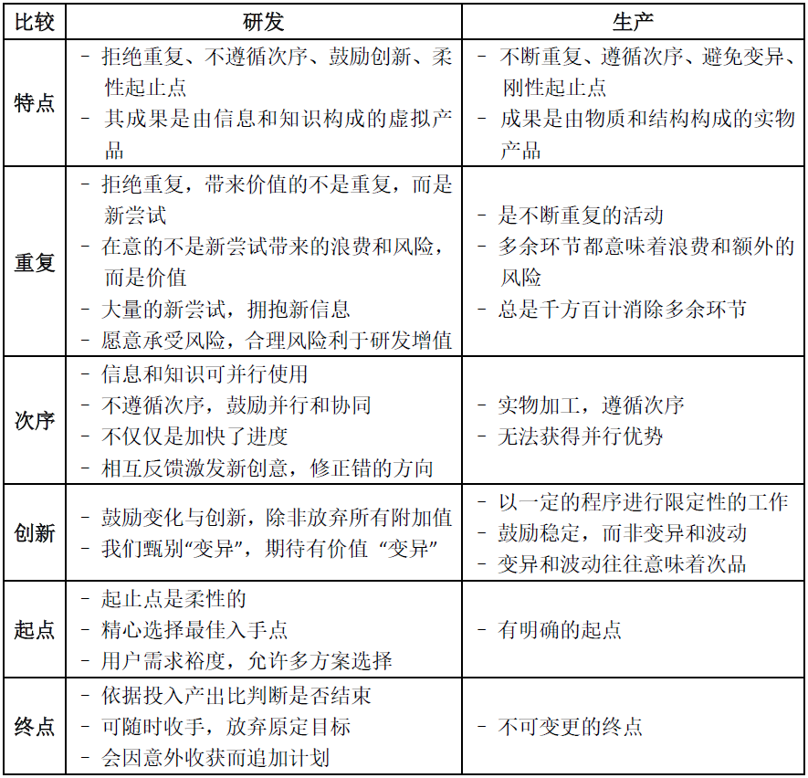 我们先通过研发和生产的比较来说明不同阶段的精益之间的差异。生产的总体特征是:不断重复、遵循次序、避免变异、具有刚性起止点,其成果是由物质和结构构成的实物产品。而研发的总体特征是:拒绝重复、不遵循次序、鼓励创新、具有柔性起止点,其成果是由信息和知识构成的虚拟产品。研发与生产的差异如下表所示。