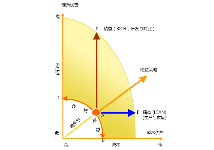 精益研发和精益商业策略则是关注创新的策略(沿着AF射线垂直行进)。该策略在不显著增加成本的前提下,可以提高产品的品质、技术含量和品牌价值,从而提升产品的附加值,达到增加竞争力的目的。采用这种策略,可以比同类产品卖得更贵,但仍然有人买,这就是精良设备和名牌产品。