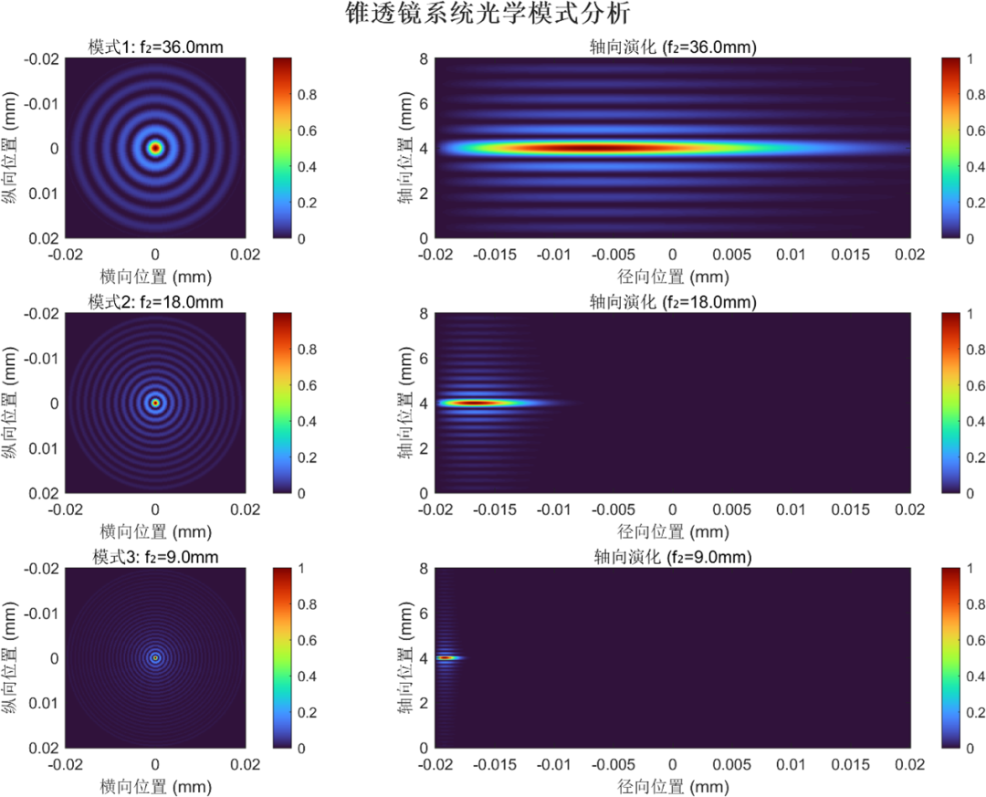 数值仿真通过数值模拟,文献系统分析了不同压缩比(如f1=250 mm, f2=36 mm,18 mm,9 mm)条件下,贝塞尔光束的主瓣半径及无衍射传输距离的变化: