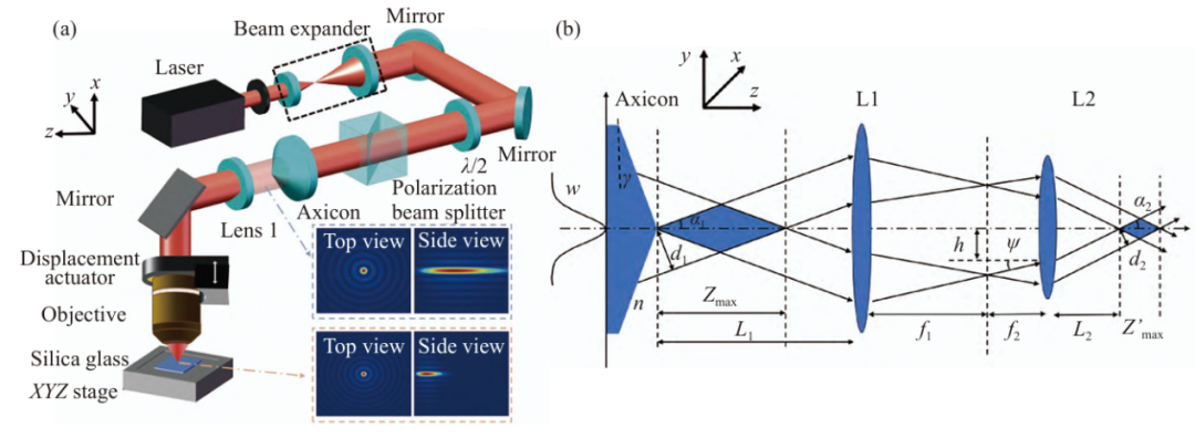 图1(a)可调谐超快激光贝塞尔光束加工系统示意图;(b)可调谐超快激光贝塞尔加工系统的几何光路图