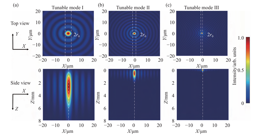 图2 不同调谐模式下产生贝塞尔光束的横截面和侧视图光强分布图。(a)可调谐模式Ⅰ;(b)可调谐模式Ⅱ;(c)可调谐模式Ⅲ
