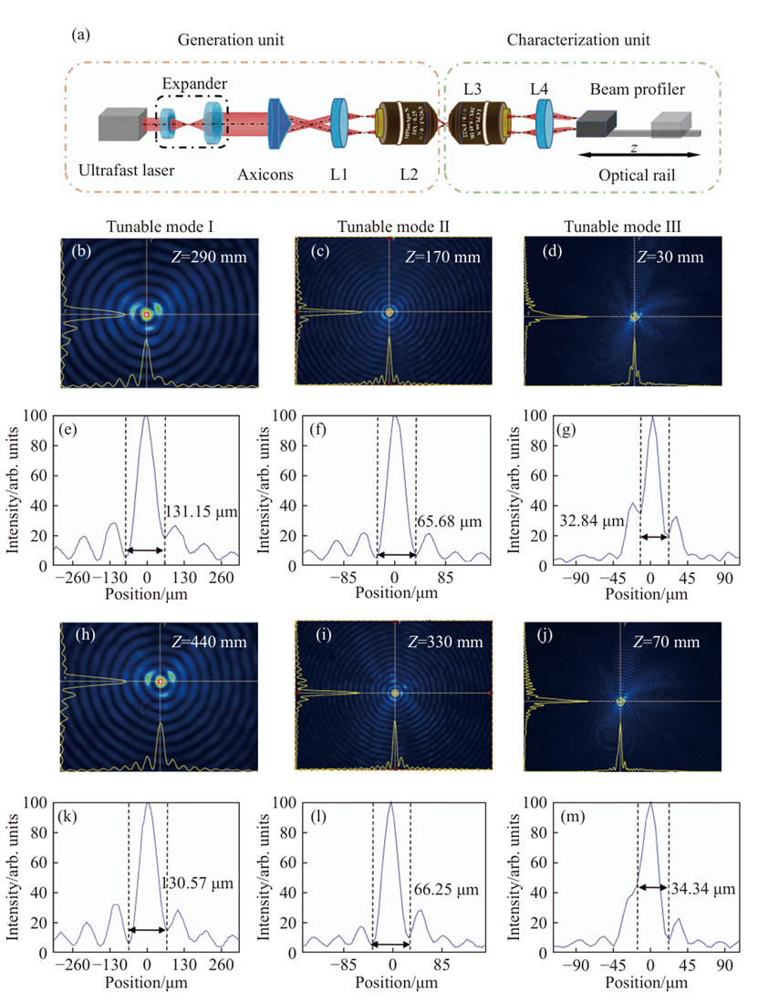 图3 (a)贝塞尔光束检测实验装置;(b)、(e)在可调谐模式Ⅰ条件下传输距离为290 mm时的贝塞尔光束横截面光强分布和截面光强曲线分布图;(h)、(k)传输距离为440 mm;(c)、(f)在可调谐模式Ⅱ条件下传输距离为170 mm时的贝塞尔光束横截面光强分布和截面光强曲线分布图;(i)、(l)传输距离为330 mm;(d)、(g)在可调谐模式Ⅲ条件下传输距离为30 mm时的贝塞尔光束横截面光强分布和截面光强曲线分布图;(j)、( m) 传输距离为70 mm