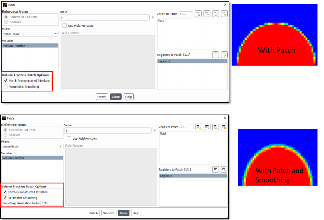 Volumetric Smoothing:根据单元邻近区域的体积平均值和选定的平滑松弛系数,实现体积分数的平滑处理