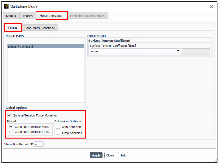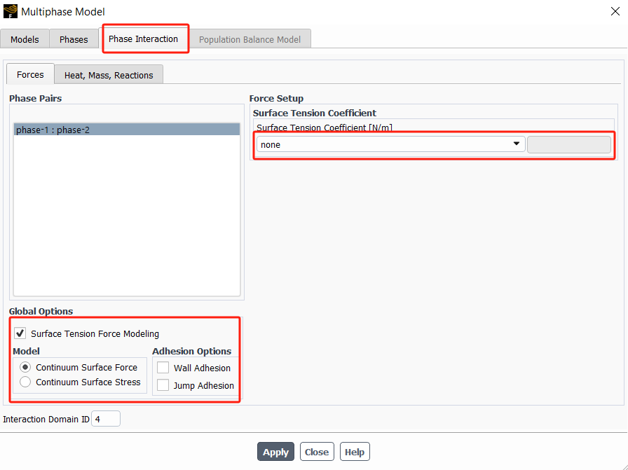 在“Phase Interaction”选项卡中,指定VOF模型的相间相互作用(例如表面张力和壁面附着力)