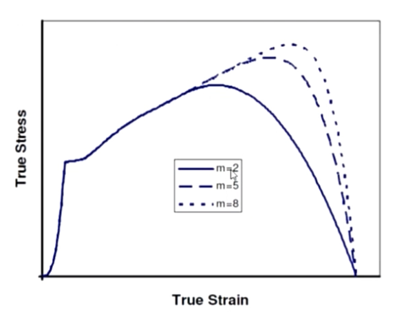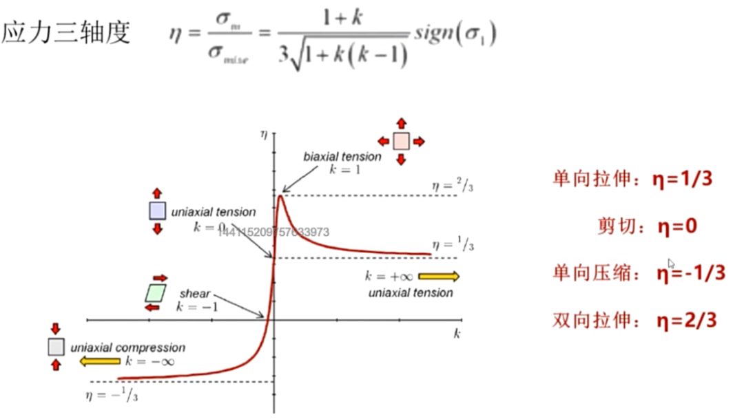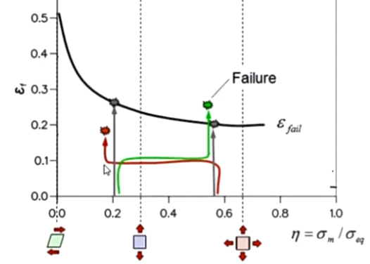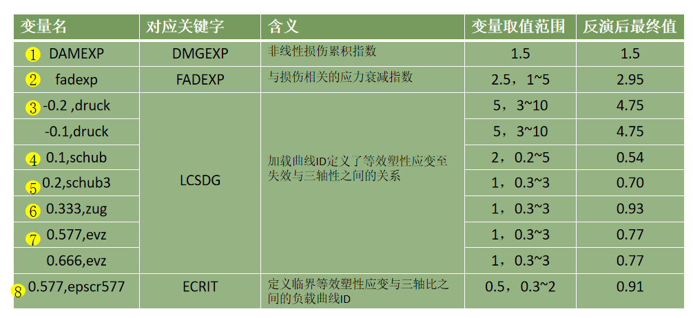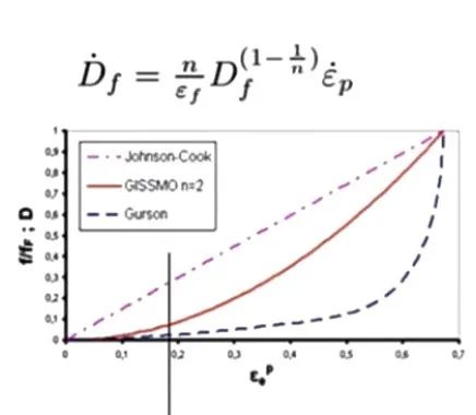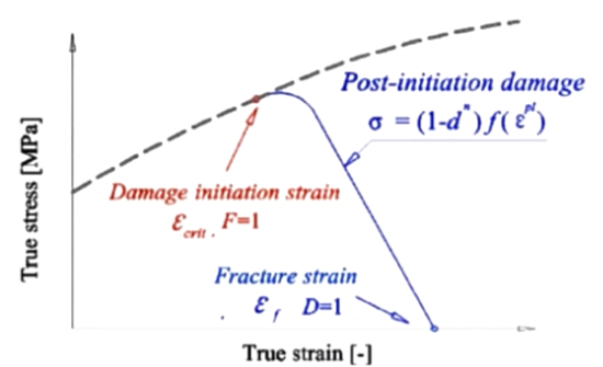 上一篇文章LSOPT&Gissmo材料参数反演中提到了整个Gissmo参数反演的过程。但是对变量的讲述并没有很详细,这里做下补充。下面是变量的设置,包括初始值以及变量的范围和LSOPT迭代优化后计算得出的最终值,总共是八个变量。变量1,DMGEXP非线性损伤累积指数,这里直接设置成了1.5,在下图的公式里就是n值,n≠1时,材料受损后,损伤进行非线性积累直到失效。变量2,FADEXP,与损伤相关的应力衰减指数,不同的值,衰减的程度不一样,如下图。变量3-7,LCSDG断裂塑性应变和应力三轴度之间的关系的曲线,最终曲线如下:应力三轴度可以用如下公式计算,最后得到样件受到纯剪切,纯拉伸和纯压缩三种状态下所对应的数值下图为断裂塑性应变和应力三轴度相对应的曲线,如果样件加载过程中从头到尾都是拉伸受力,那么它的断裂失效应变就和灰色曲线一样笔直上升,对应当前的断裂失效应变如果在拉伸加载的过程中,加载方式改变,那么所对应的断裂失效应变就会和绿色和红色的曲线一样,落在不同的断裂失效应变曲线点上。变量8,ECRIT材料不稳定性对应的应变和应力三轴度之间的关系。最终曲线如下:材料的不稳定性:材料不稳定性与应力/损伤耦合,该特性主要用于描述损伤累积与应力减弱之间的耦合关系;即在塑性应变达到临界应变之后,流动应力会因为损伤累积而逐渐减少。简单理解:下图中样件在拉伸过程中,塑性阶段的应变到达临界值后,应力不再单调递增(虚线),而是在临界值(颈缩)后,应力呈现下降趋势(实线)。 综上所述,GISSMO断裂准则模型一共含有五个未知参数,分别为应力三轴度n,材料损伤指数n,材料在不同应力状态下失效时的等效塑性应变ξ,发生不稳定性变形时的等效塑性应变εp.loc,以及应力衰减指数m。
