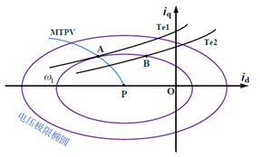 图中W1对应的电压极限圆上的工作点A所对应的输出转矩Te1最大,可以由几何关系得到,恒转矩曲线Te1与该电压极限圆相切于A点。同时恒转矩曲线Te2与电压极限圆相交于B点,可对比发现Te1比Te2大,且该切点对应的转矩比在该椭圆所有的电流工作点所对应的转矩都大。