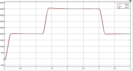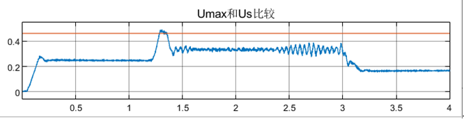 从图(3.2)可知,在1.2秒时,转速超过基频(电机额定转速为3000rpm,但电机实际运行在4000rpm),d轴弱磁补偿电流反向增大。定子电压在超过限幅值后立即调节到限幅值之内,说明基于电压反馈闭环的弱磁调节起到扩速的作用。