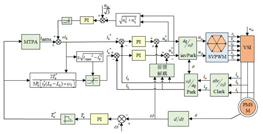 在实际应用中,当电机进入弱磁控制区,电流控制器发生输出电压饱和时,电机的输出转矩能力受到较大影响,很可能使永磁体永久退磁,进而导致整个控制系统失控。快速、稳定、精确地追踪输入指令,提升控制系统性能,一直是研究的热点。
