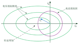 电压的极限圆随转速的提高而内缩,电流极限圆保持不变。综上所述,电机在实际运行过程中需要考虑电压和电流共同约束,需要规划定子电流工作在电流极限圆和电压极限圆的共同部分。若不满足任何一个约束条件,即电流工作点落在电流极限圆或者电压极限圆之外,电机将不能在高速下维持恒功率调速。并且随着电机不断升速,电流极限圆与电压极限椭圆的公共部分区域会越来越小,也即电机所能运行的范围也越来越窄,因此对电流规划的要求也越来越高。