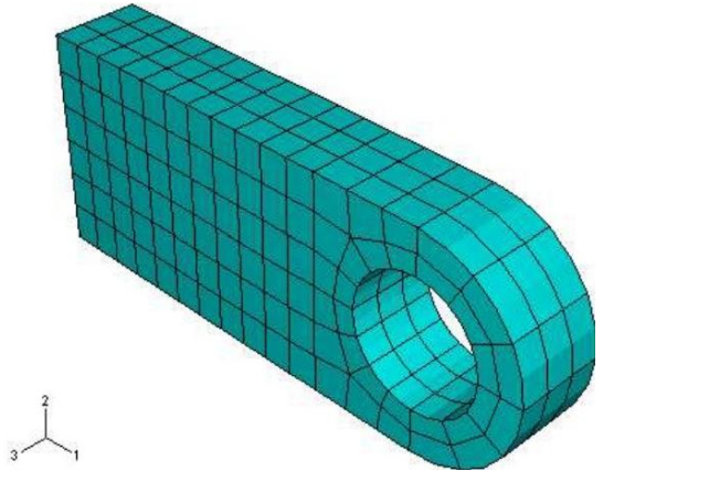 在开始为特定问题构建网格之前,您需要考虑将使用的元素类型。例如,如果更改为线性的低积 分单元,则使用二次单元的合适网格设计很可能不合适。对于此示例,请使用具有降低积分的 20节点六面体单元 (C3D20R)。 选择单元类型后,可以设计连接接线片的网格。关于此示例的 网格设计,最重要的决定是在凸耳孔的圆周周围使用多少个单元。连接接线片的可能网格如图 4-21 所示。