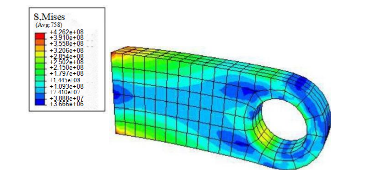 我们还可以切割模型,使内表面可见。例如,您可能想要检查零件内部的应力分布。可以为此目的创 建视图切口。在这里,通过凸耳进行简单的平面切割,以查看米塞斯应力分布通过零件的厚度。