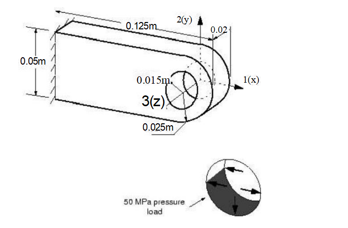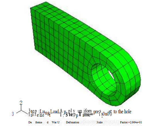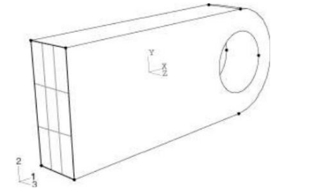 凸耳的一端牢固地焊接到一个巨大的结构上。另一端包含一个孔。通过凸耳的孔放置一个螺栓。要求确定在负30方向上对螺栓施加2kN 载荷时凸耳的静态挠度。我们的目标是检查凸耳的静态响应,因此应使用Abaqus/Standard分析。我们做出以下假设来简化此问题:
