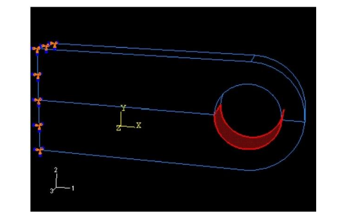 ●将在孔的下半部分使用分布式压力来加载连接凸耳,而不是在模型中包括复杂的螺栓-凸耳相互作用( 参 见图4 - 14)。