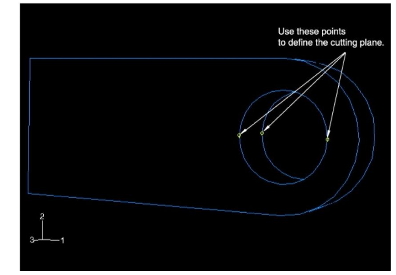 2.使用“分区单元:定义切割平面”工具 将零件分成两半。使用3点方法定义切割平面。 当系统提示您选取点时,Abaqus/CAE 会加亮您可以选择的点:顶点、基准点、边中点或弧 中心。在该模型中,用于定义切割平面的点如图4-19 所示。同样,您可能需要旋转视图以 方便您的选择。