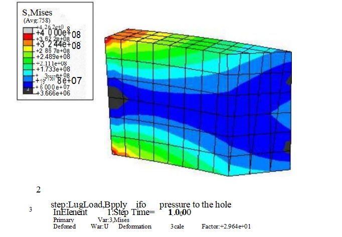 ●施加的均匀压力的大小为50 MPa:30kN/(2×0.015m×0.02m)。 检查接线片的静态响应后,修改模型并使用Abaqus/Explicit 来研究凸耳突然加载导致的瞬态动态效应 。