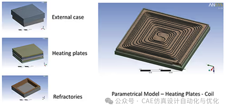 该解决方案包含两个步骤。在第一步中,使用ANSYS Workbench创建了一个CAD(计算机辅助设计)模型,该模型基于实验数据代表了初始加热板配置。这些数据是进行瞬态热分析所需的有限元模型的基础。该分析有助于找到在优化运行中表现最佳的材料,并达到优化目标。这一步骤是为了建立正确的设置,并基于实际参考模型验证计算过程的正确性。