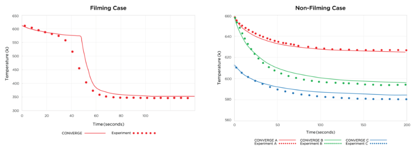 当然,这种加速技术必须经过适当的验证,以确定对准确性的影响。在尿素喷雾、飞溅、液膜传热和蒸发,以及金属温度预测中,最常见的验证案例是Birkhold液膜平板实验[4]。在该案例中,脉冲式的尿素水溶液喷射到一个薄的扁平金属板上,热空气在平板的上方和下方流动。热电偶布置在液膜区的前部。要想成功验证这种情况,需要预测干燥冷却过程中温度下降的初始斜率,捕捉液膜开始形成并快速降温时的温度,以及液膜完全发展时的最终温度。Birkhold平板实验案例的CONVERGE流场冻结结果如图3的左侧所示。我们可以看到三个关键参数都很一致[5]。注意,要达到这个精度,需要对Kuhnke飞溅模型常数进行适当标定。不过一旦完成标定之后,同样的模型常数也可以准确预测无液膜形成条件下的平板温度。