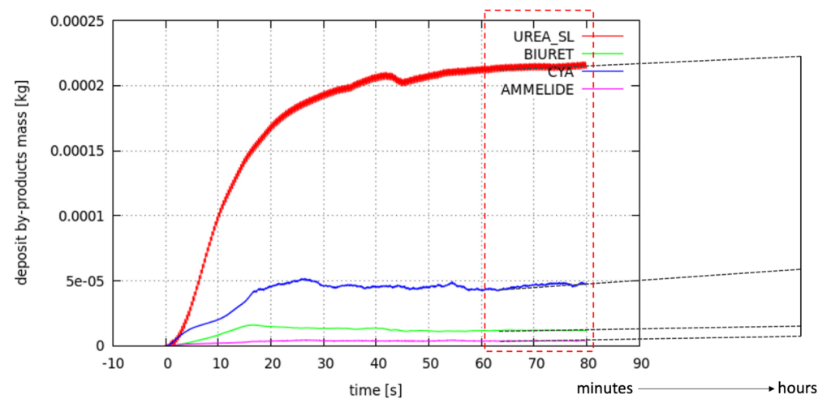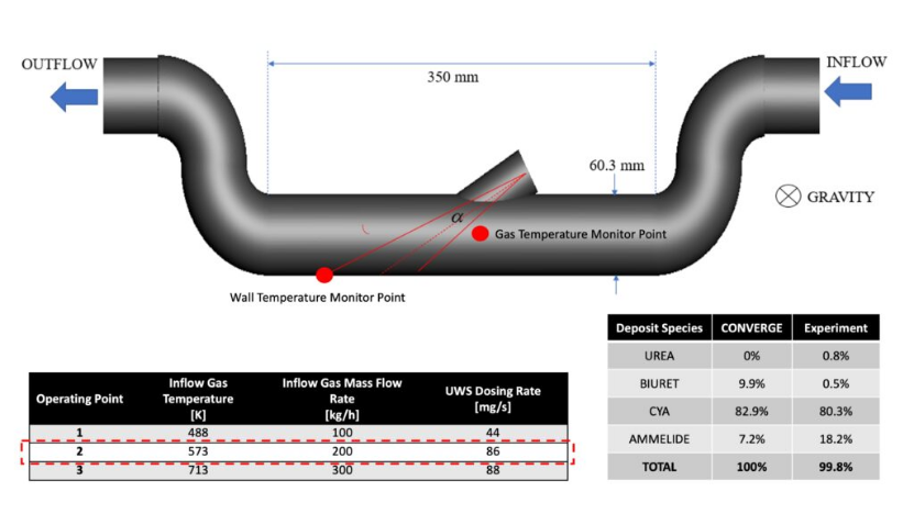 基于尿素详细分解机理的CFD方法,使我们可以从传统的结晶风险预测经验模型转换成对实际沉积物形成的直接预测。CONVERGE的尿素详细分解模型已经在经典基础案例[2、6]和商业案例[3]中得到了有效验证。