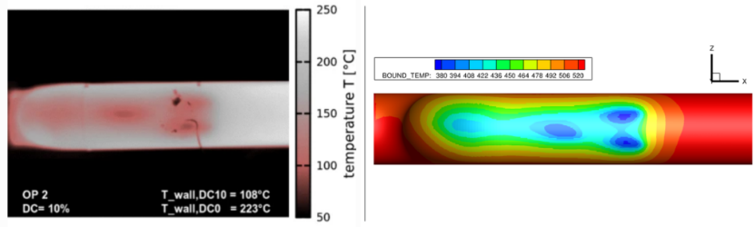 图5:结晶位置外壁温度对比(左侧为实验结果,右侧为CONVERGE结果)。