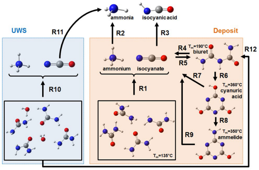 不幸的是,尿素液膜在130°C到165°C的温度下会形成结晶沉积,且需要非常高的温度才能去除。沉积物的去除是通过分解来完成的,如图1的右侧所示。首先形成双缩脲(biuret),然后需要360°C的高温才能分解转化成三聚氰酸(CYA)和三聚氰胺(ammelide)。