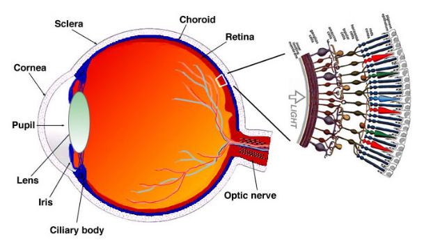 每个相机因为镜头、传感器及调 教的不同,成像效果也会有差异,人眼也不例外。人眼是一个特殊的相机,它有自己的特性,想要了解这些特性,首先我们需要了解人眼的感光原理。人眼前部的视网膜、晶状体、玻璃体等一系列肌肉和结构用于调节成像质量,他们的作用类似于相机的镜头吧,位于视网膜上的视锥细胞和视杆细胞负责感受光的刺 激,将光信号转换为生物信号传输给大脑。这其中视锥细胞分为RGB三种,分别对这三种敏感。强光环境下视锥细胞比较活跃,对强光及颜色有着较强的分辨能力。弱光环境下,视杆细胞活跃,视杆细胞对光线的强弱比较敏感,而对颜色不敏感。另外人眼的可见的动态亮度范围大概在10-6~106cd/m2,超过市面上几乎所有显示产品的显示范围。如果要通过仿真的方式再现人眼所看到的图像,这些特性我们必须考虑到。