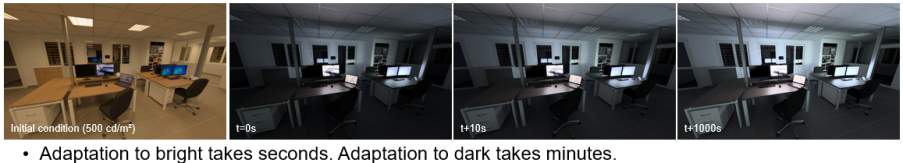 人眼视觉具有延续性,人眼没有办法快速的适应大的亮度变化,例如当人在夜晚的房间,突然关灯这样一个工况,关灯瞬间,人眼会觉得什么都看不见,这就是人眼视觉延续性的表现,人眼的感光结构和细胞没有办法完成这种瞬间的转变。ANSYS SPEOS可以通过设定完成这种转换,通过对之前所处环境的亮度设定和适应时间的设定,通过仿真可以再现这种结果。
