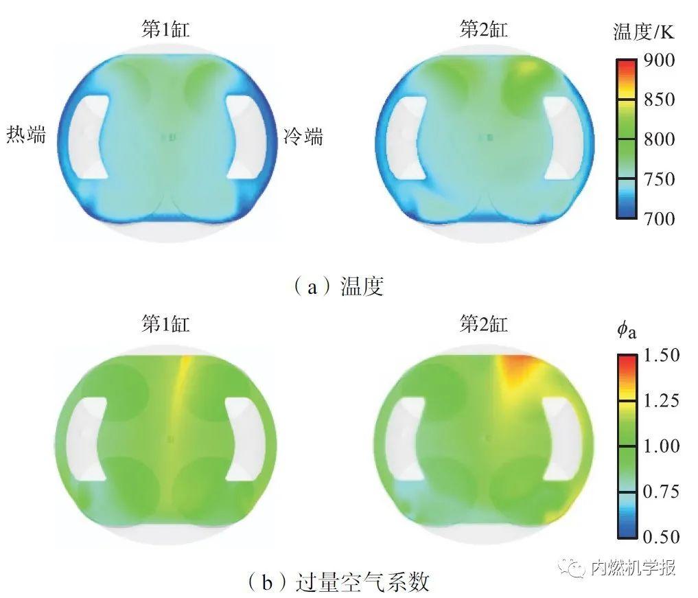 图4 第1缸和第2缸在-6° CA ATDC的温度和过量空气系数分布