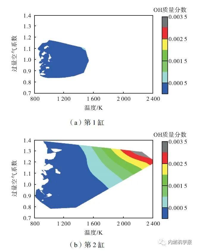 图8为末端混合气中OH质量分数分布。第1缸末端混合气产生少量OH自由基且温度不超过1 600 K。第2缸则产生大量OH自由基且质量分数超过0.002区域集中在温度超过2 000 K处,介于测点5和测点6中间区域产生自燃且自燃程度大于第1缸。OH质量分数大于0.001的区域集中在过量空气系数为1.00~1.35、温度为1 600~2 400 K之间,自燃发生在高温、燃油浓度偏稀区域且伴随OH产生。