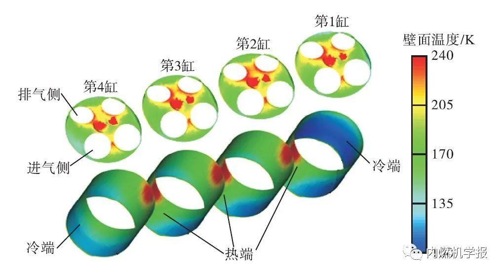 模拟工况在转速为1 835 r/min、IMEP为0.93 MPa下进行,活塞、进/排气道、进/排气阀和进/排气歧管温度边界采用固定壁面温度,按边界分区给出工程经验值。缸盖和缸套壁面温度采用基于缸内燃烧分析得到的三维金属温度场方法赋值,图2为为原机缸盖和缸套壁面温度。模型边界条件和实验验证等信息参见原文[1]。