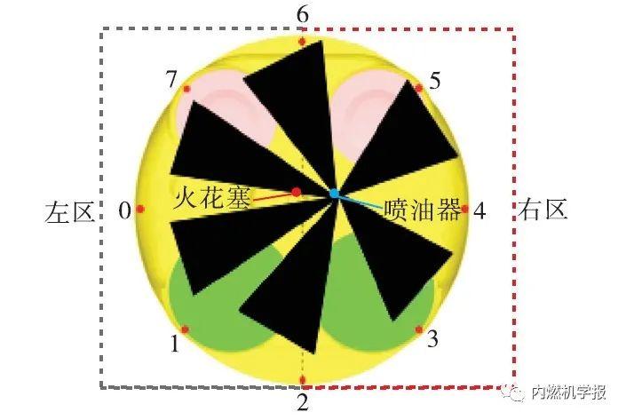 图3为缸内测点分布及分区示意,共布置8个测点,在缸盖底平面以下0.5 mm且距离缸套0.5 mm的圆周方向上,且呈45°夹角均匀分布,其中测点1~3对应靠近进气侧区域,测点5~7对应靠近排气侧区域。中置直喷汽油机的火花塞安装在缸盖燃烧室中心位置附近,喷油器油束出口位置在右区。在油束靶点布置上,4束油束朝向左区喷射,2束油束朝向右区喷射。