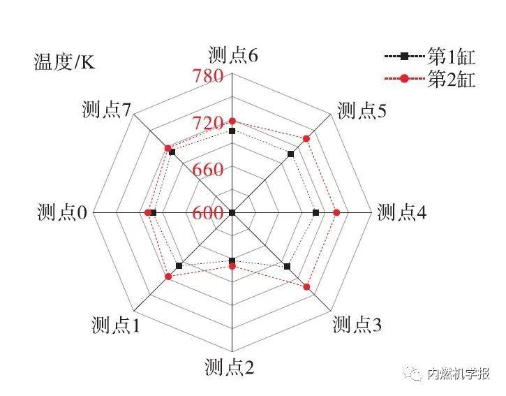 图5 第1缸和第2缸在-6° CA ATDC的测点温度分布